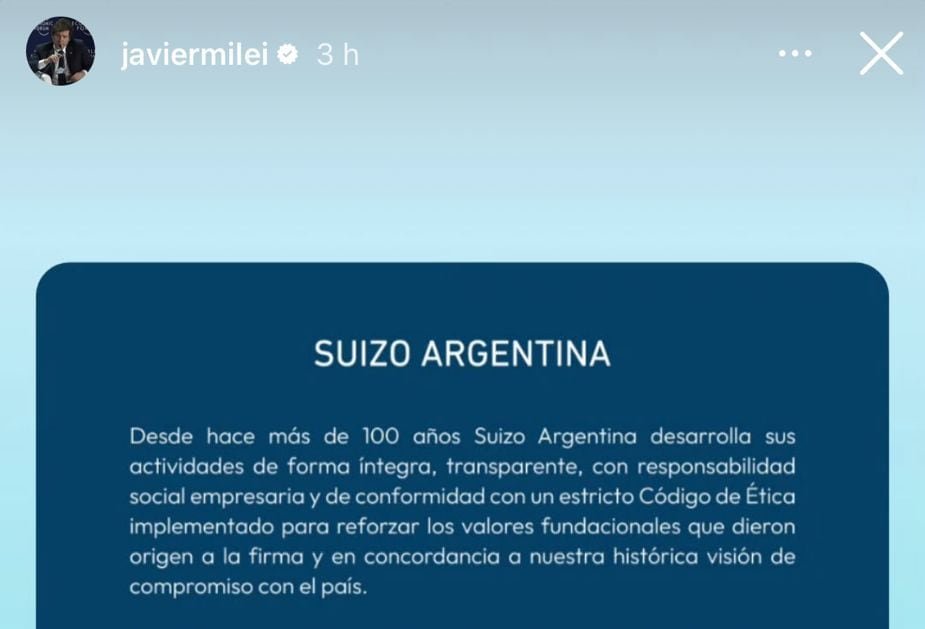 El presidente Javier Milei compartió este martes en su cuenta de Instagram un comunicado de la droguería Suizo Argentina, el laboratorio mencionado en el escándalo por los audios de conversaciones privadas que se le atribuyen al ahora desplazado titular de la Agencia Nacional de Discapacidad, Diego Spagnuolo.