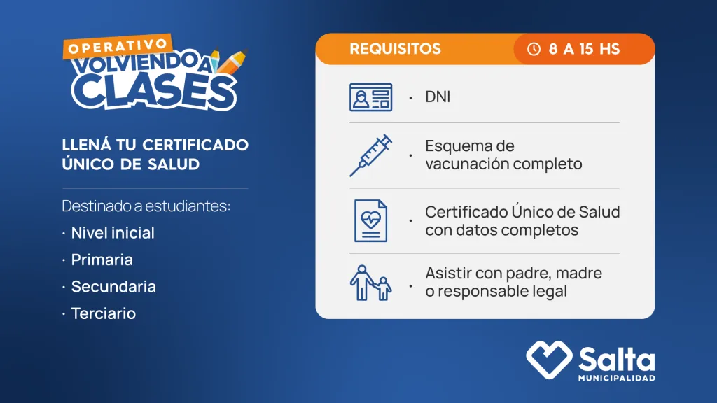 La atención se brindará entre el lunes 19 y el viernes 30 de enero de 8 a 15 hs. en Paraguay 1240. Los profesionales de la salud completarán el certificado de salud de los niveles, primario, secundario y terciario. Los menores no pueden concurrir solos.